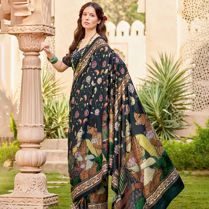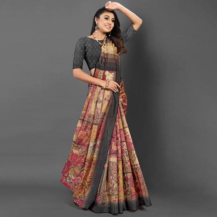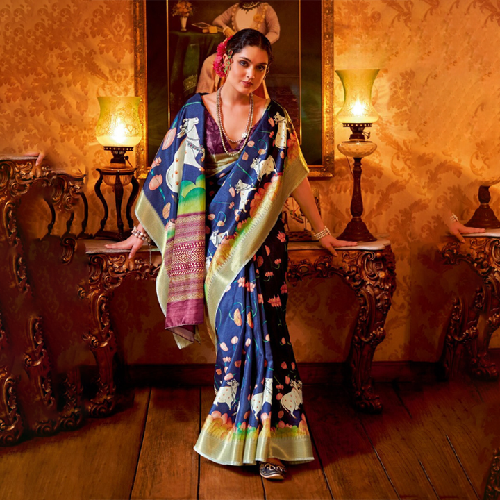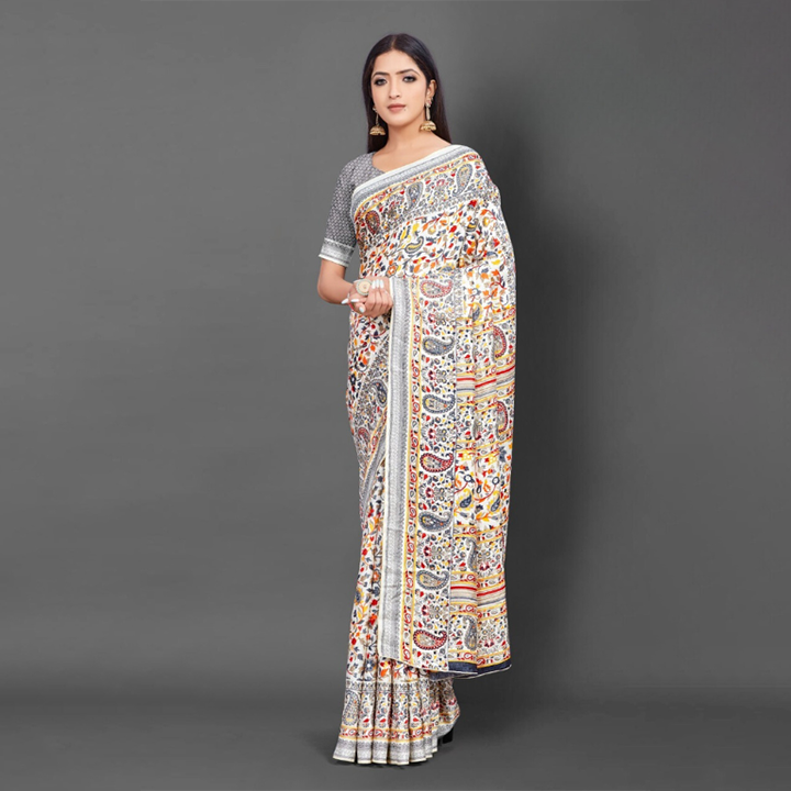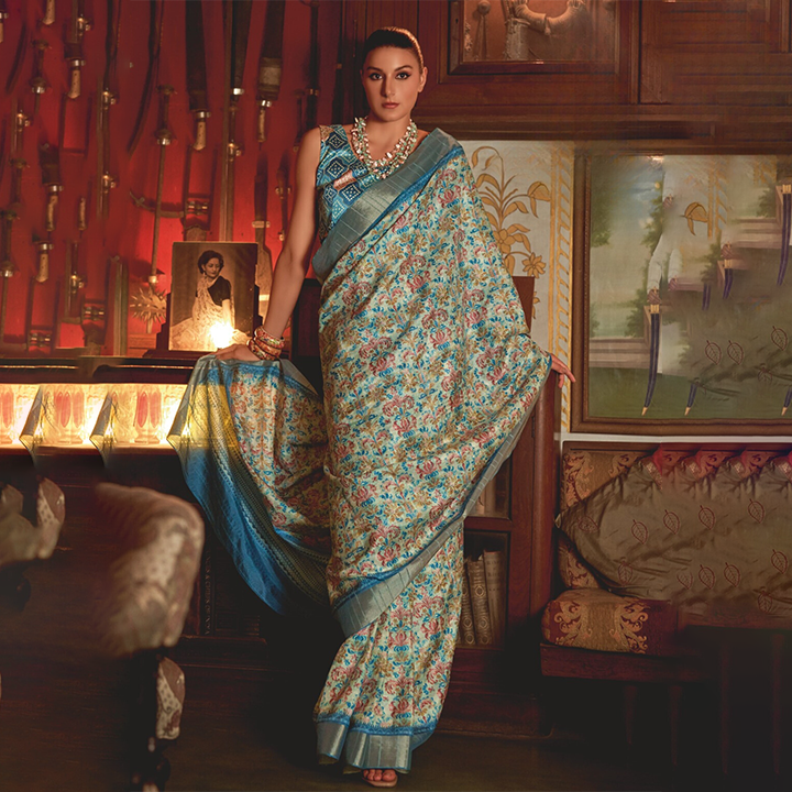 Introducing our luxurious saree, adorned with exquisite prints that capture the essence of heritage and sophistication.